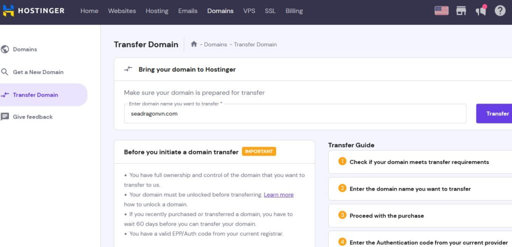 – Add tên miền “seadragonvn.com” vào hosting của hostinger: Đăng nhập vào Hostinger => Tab “Domains” => chọn “Transfer an existing domain” => nhập tên miền cần thêm vào hostinger (vd:seadragonvn.com) => Transfer