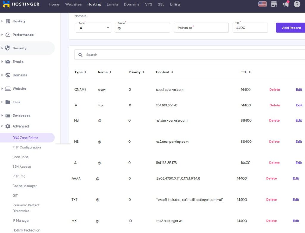 – Khai báo các thông số để website và email hoạt động trên hosting của nhà cung cấp hostinger: Đăng nhập vào Hostinger => Tab “Hosting” => chọn “Manager của seadragonvn.com” => chọn “Advanced” => “DNS Zone Editor => khai báo các record như hình sau: