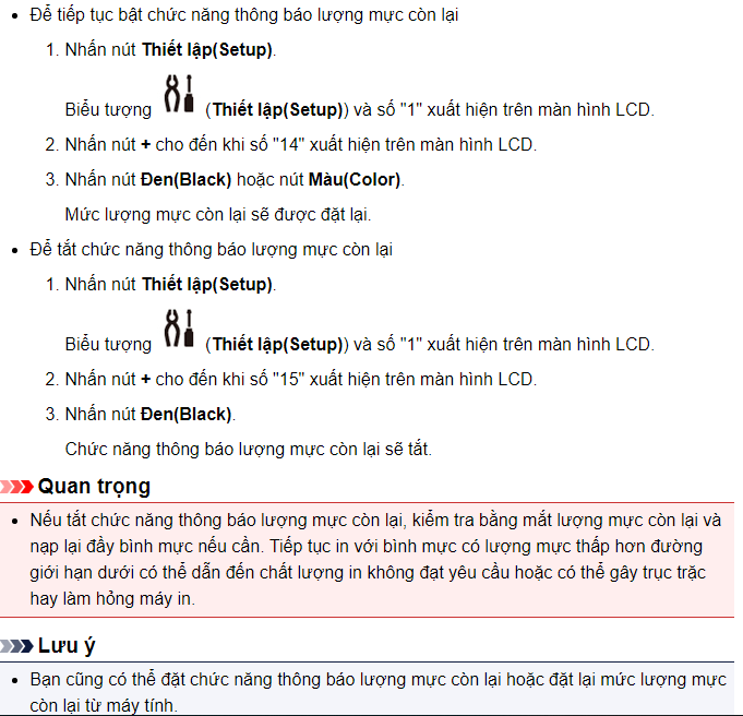 TRƯỜNG HỢP 2: Bật/ Tắt chức năng thông báo lượng mực còn lại trên máy in Canon G3010